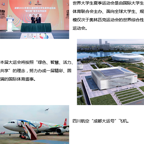 2021年大运会是我国西部地区首次举办的世界级综合性运动会,是新时代赋予成都的历史使命和国家赋予成都的重大任务。在党中央、国务院的亲切关 怀和国家有关部委、省委省政府,市委市政府的大力支持下,成都2021年第31届世界大学生夏季运动会筹备工作正有力有序有效推进。